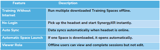 Offline Mode is a feature that allows you to use SynergyXR Training Spaces without an internet connection. It works by letting you download specific Spaces to your device ahead of time. Once downloaded, those Spaces can be opened and used offline.