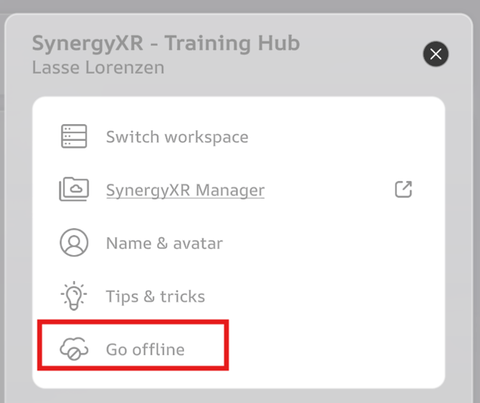 (If you accidentally exit Offline Mode but do not log in, you can still access the downloaded Spaces by completely closing the SynergyXR application and opening it again.)