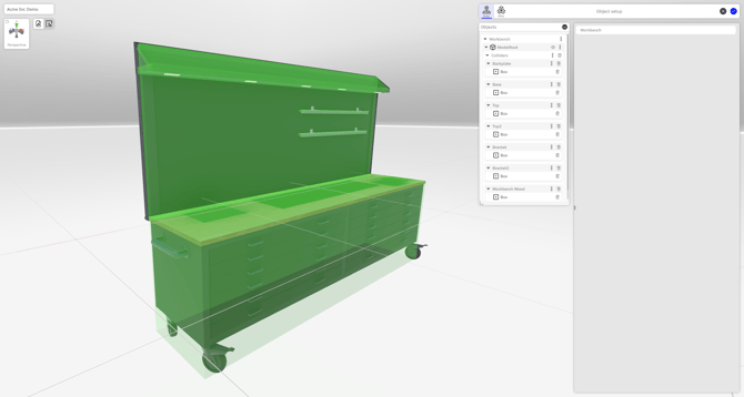 All instances are linked to the configured content. Users can always adjust the configuration by pressing the cogwheel icon next to a configured 3D object. Any changes made to the configuration are automatically applied to all instances added to the scene.