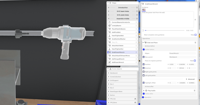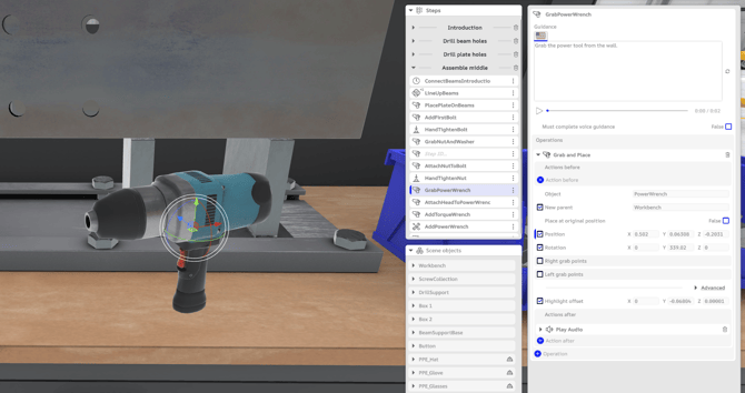 When hovering over an object in the "Scene objects" list, the correspondent instance is highlighted in the 3D scene for easy identification. The same happens when hovering over an object used as a target in the steps list, the correspondent instance is highlighted in the 3D scene for easy identification.
