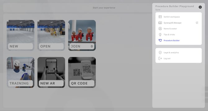 The Procedure Builder can be accessed from the settings menu in the top-right corner of the main UI of SynergyXR for PC (Windows and Mac).