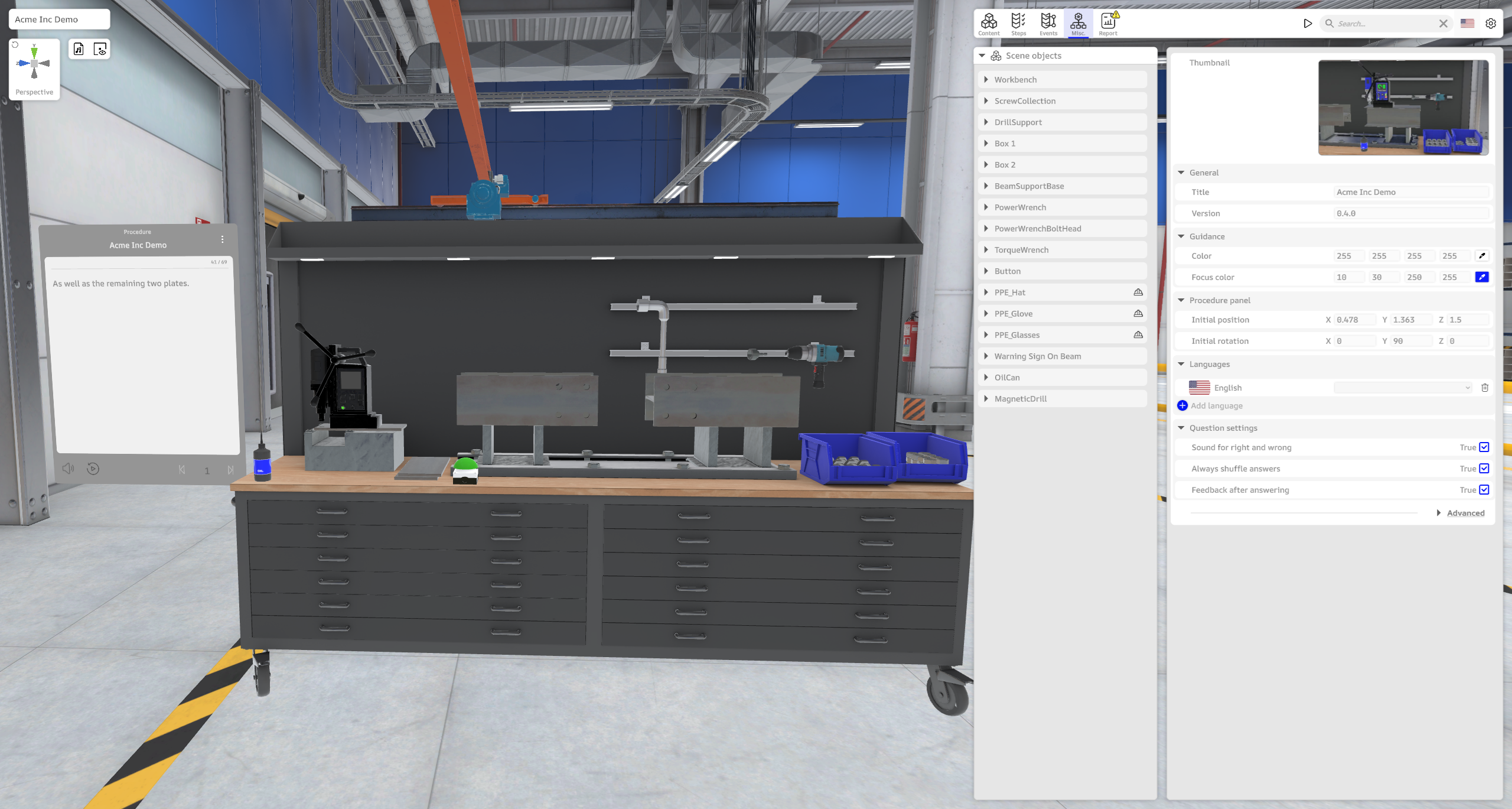 - Misc: This is where users administer the procedure, by renaming the procedure, generating a thumbnail, add languages and define guidance voice, define the virtual bounds of the procedure, and defining the initial position of the Procedure Panel. It is also possible to overwrite the standard colors used for visual guidance (white standard white for guidance and the blue for focus), as well as setting a few general settings for the Question operation.