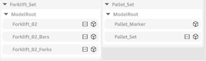 This procedure consists of two steps and one event. There are nine models and six audio files. Additionally, two of the models, namely the Forklift_Set and the Pallet_Set, are parents, meaning that they have additional models (children) grouped under them. In the case of the Forklift_Set, this consists of the vehicle’s main body, the vertical bars and the forks.