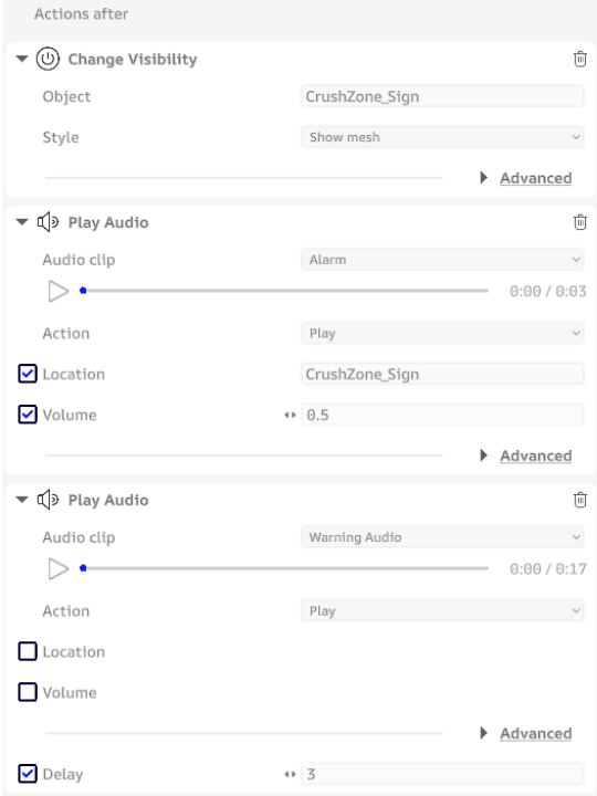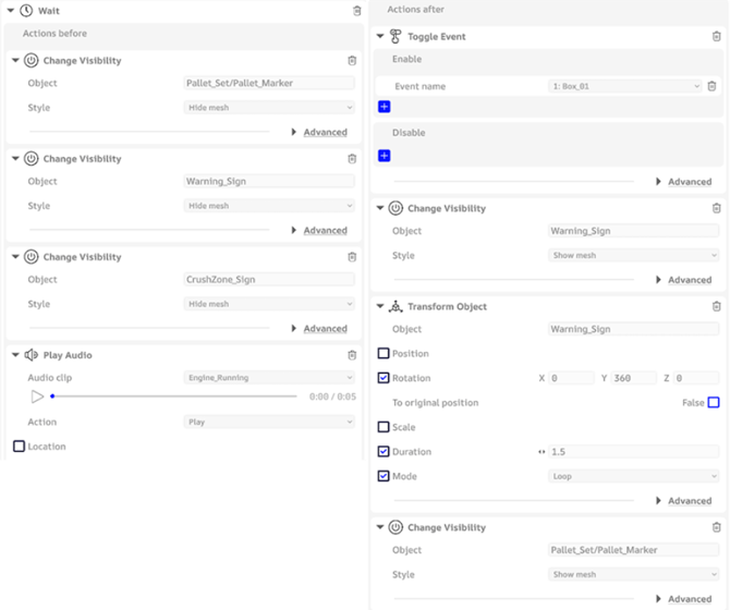 - Set the Pallet_Marker, the Warning_Sign and the CrushZone_Sign as the objects for the three Change Visibility actions and choose Hide Mesh as the Style setting.