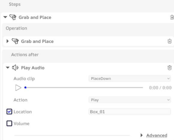 In this example, the user grabs the box on the left and places it on the pallet, proceeding into the next event step – another Grab and Place operation for the box on the right. By arranging interactions in a sequential way, the procedure forms a cohesive and logical narrative, where each operation naturally leads to the next.