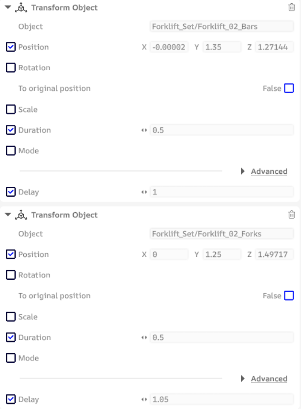 - Add another Transform Object action and assign the Forklift_02_Forks asset.