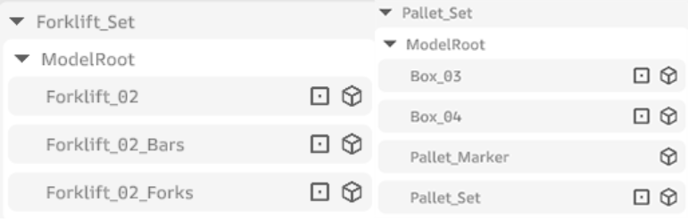 This procedure consists of two Steps and two Events. There are six models and six audio files. Additionally, two of the models, namely the Forklift_Set and the Pallet_Set, are parents, meaning that they have additional models (children) grouped under them. In the case of the Forklift_Set, this consists of the vehicle’s main body, the vertical bars and the forks.