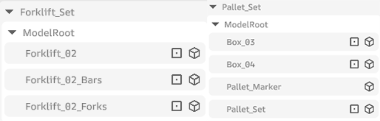 There are four models under the Pallet_Set: the wooden pallet with the stack of boxes, two extra box models and the red floor marker.