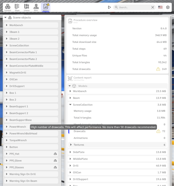 Built into the Procedure Builder is the procedure performance report providing users with an overview of potentially troublesome content contained in the procedure. Each new piece of content is analyzed as it is added to the procedure, and any warnings are shown to the user right away. Read more about content validation in SynergyXR.