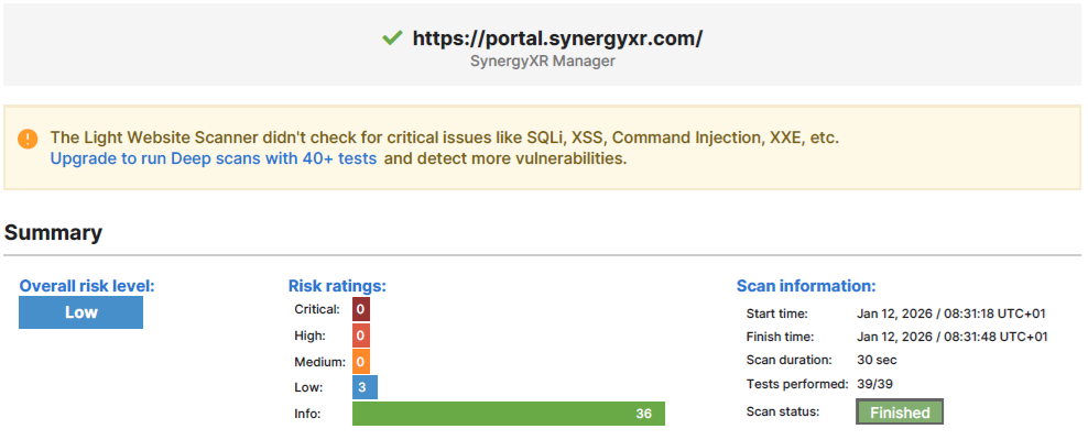 SynergyXR are committed to continuous improvement of the IT security offered by the SynergyXR platform. As new relevant tools are identified, the result of these will be added to the test suite to give as complete a picture of the security state as possible.