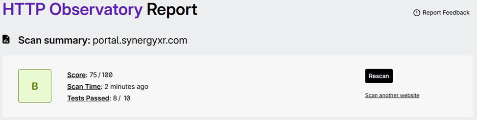 We utilize the tool SecurityHeaders.com (https://securityheaders.com/) to evaluate our website’s HTTP security headers, which help protect against common vulnerabilities. A strong score is important to us as it shows our dedication to secure web practices, safeguarding user data and reinforcing trust in our platform's safety.