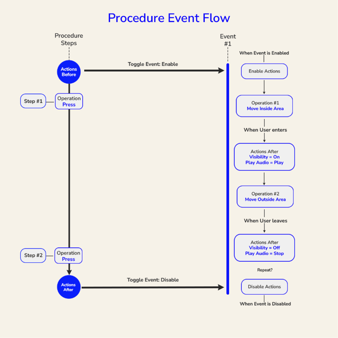A simple way to understand events is to see them as extra steps that are triggered by the user’s behavior during the main steps of the procedure. The flowchart below represents the relationship between Steps, Operations, Actions and Events.